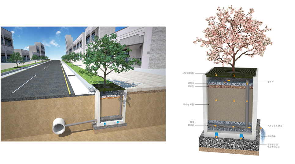 - 나무여과상자는 나무 또는 큰 관목이 식재된 박스를 매립하여 식재토양층의 여과 및 나무의 생화학적 반응을 통해